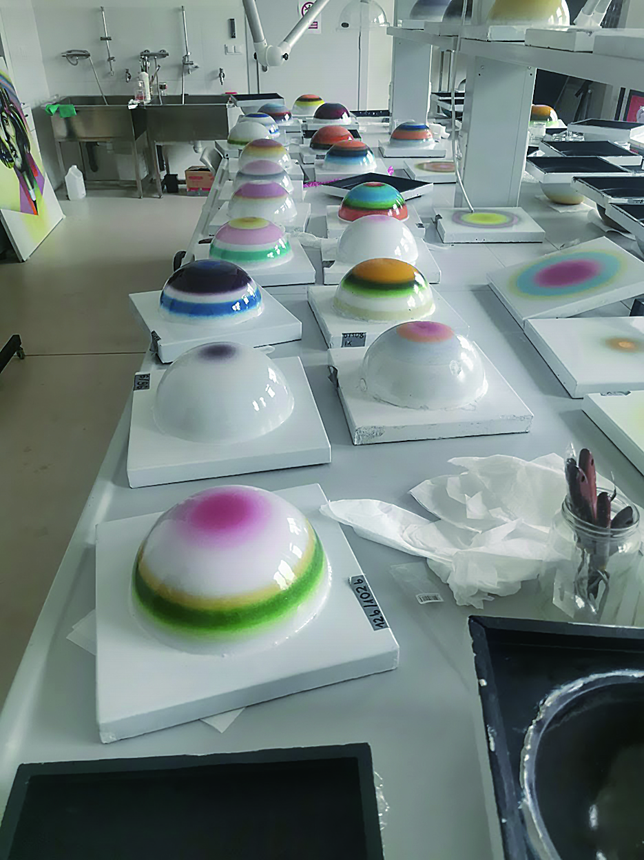 – Kropki, bąble... różnie się je nazywa – wróciły, a z baneru Dział Promocji i Komunikacji zlecił uszycie plecaków, które rozeszły się w mgnieniu oka. Ta popularność mozaiki Stefana Knappa uzmysłowiła mi, że my po prostu ją lubimy, podoba się nam, więc w Roku Jubileuszy UMK – w roku akademickim 2024–2025 postanowiłam jeszcze bardziej wykorzystać ten promocyjny atut. Produkty, które powstawały w Roku Jubileuszy – opakowania kaw, miodów, pierników, zeszyty – posiadały na opakowaniach motywy odwołujące się do mozaiki Knappa. Potem powstała limitowana seria – poduszki, koce, gra „memory” – według artystycznej wizji prof. Aleksandry Sojak-Borodo. Ale najważniejszym akcentem była monograficzna wystawa prac Stefana Knappa sprowadzonych do Torunia z Wielkiej Brytanii, szeroko reklamowana w mediach społecznościowych, na afiszach, plakatach, na tramwaju...
